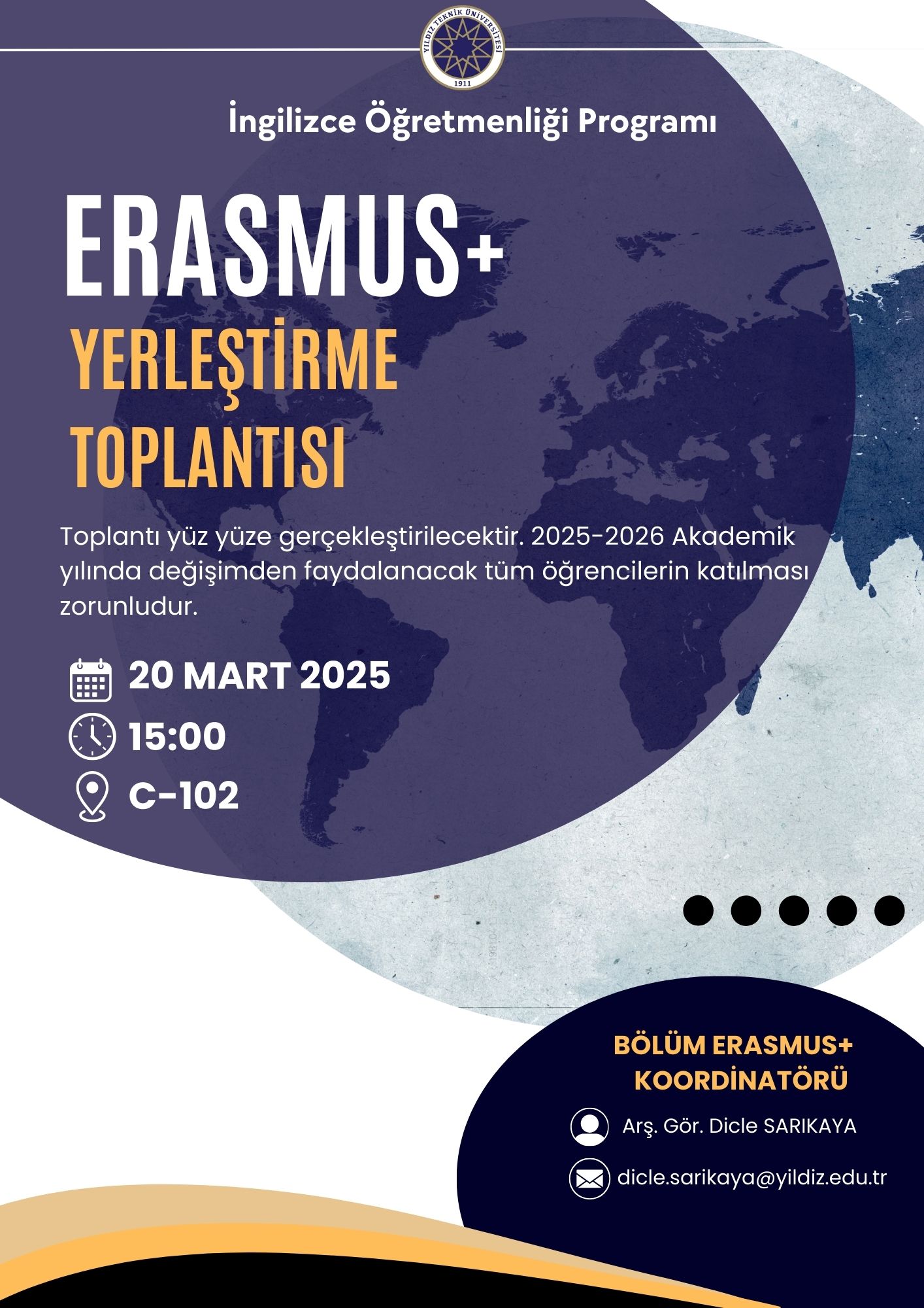 2025-2026 yılı Erasmus+ yerleştirmeleri 20 Mart Perşembe günü saat 15:00'te C102 numaralı derslikte yapılacaktır. Toplantıya yüz yüze katılım zorunludur. Adayların en az 3 alternatifle toplantıya katılması gerekmektedir.