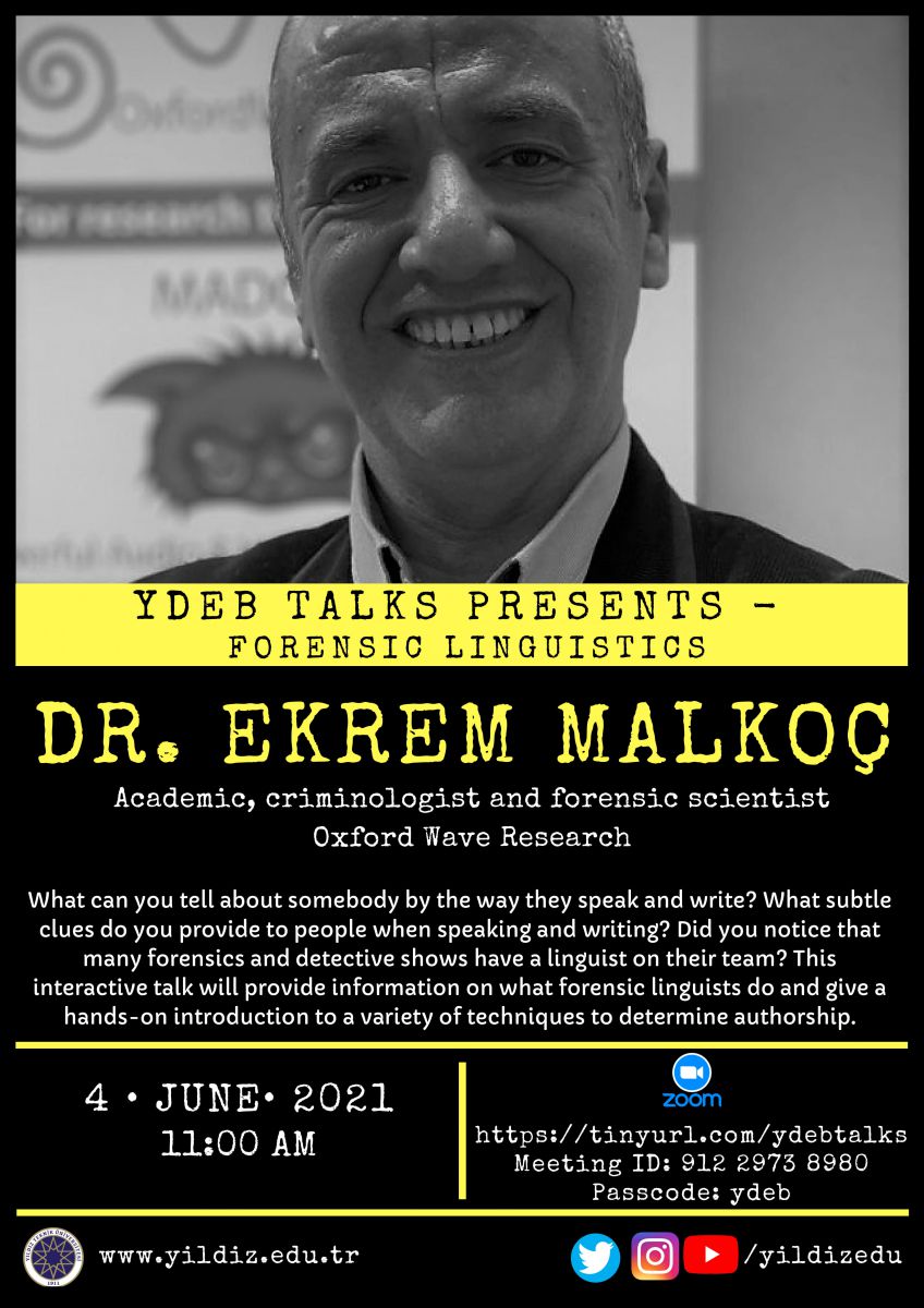 Nasıl konuştuğu ve yazdığı kişi hakkında bize neler söyler? Karşımızdaki kişilerle konuşurken ve yazışırken onlara kendimiz hakkında ne gibi ince ipuçları veririz? Birçok adli tıp ve polisiye konularını işleyen dizilerde yapım ekibinde bir dilbilimci olduğunu fark ettiniz mi? Bu interaktif konuşma, adli dilbilimcilerin ne yaptıkları hakkında sizlere bilgi verecek ve bir metnin yazarını belirlemek için hangi tekniklerin kullanıldığını uygulamalı gösterecek.