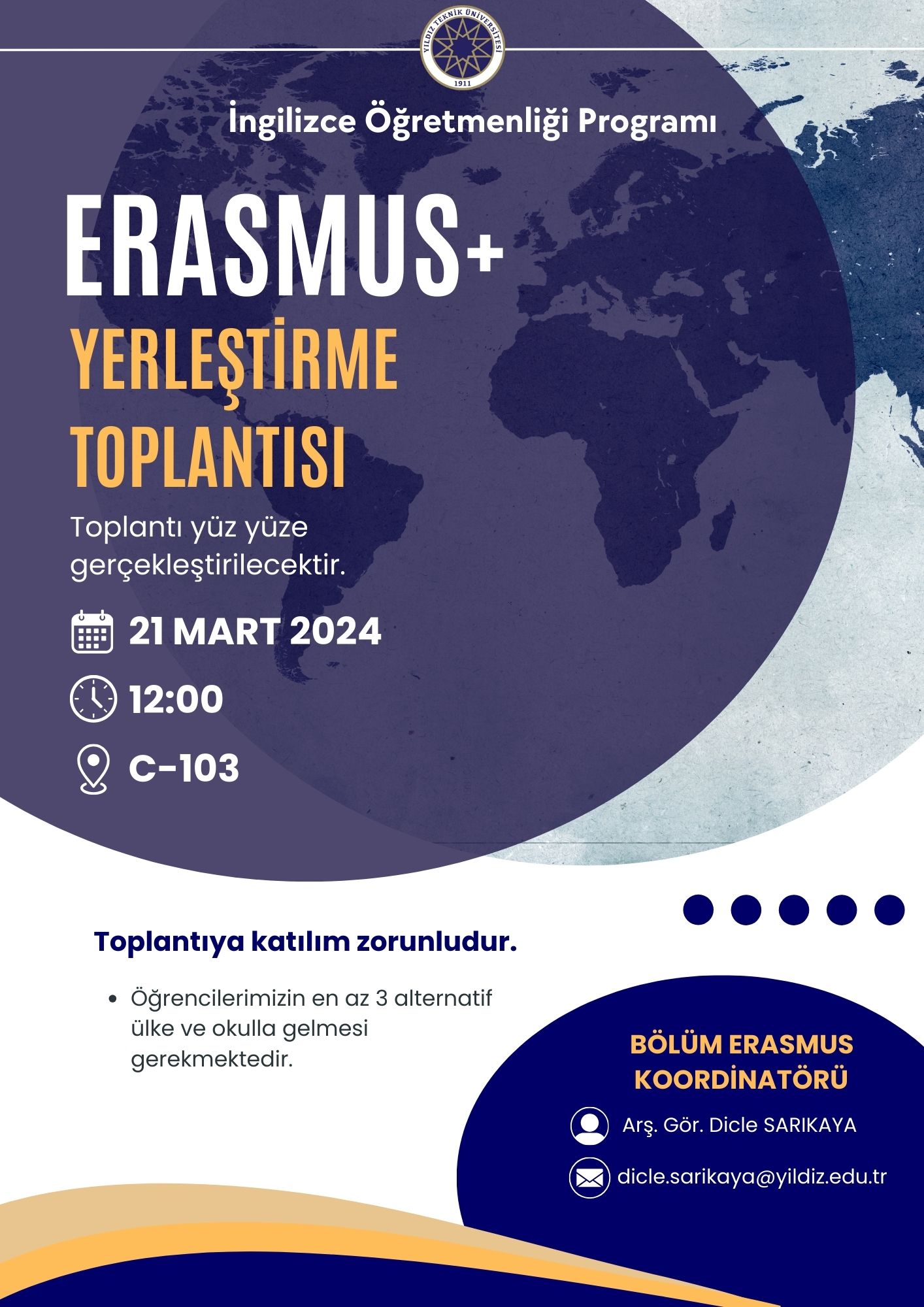 21 Mart 2024 Perşembe günü C-103 numaralı derslikte Erasmus+ yerleştirme toplantısı yapılacaktır. Gitmek isteyen tüm öğrencilerin toplantıya katılması zorunludur. Katılmayan öğrencilerin yerleştirmesi yapılamamaktadır. Ayrıca, öğrencilerimizin en az 3 alternatif okul/ülke ile toplantıya gelmesi gerekmektedir.