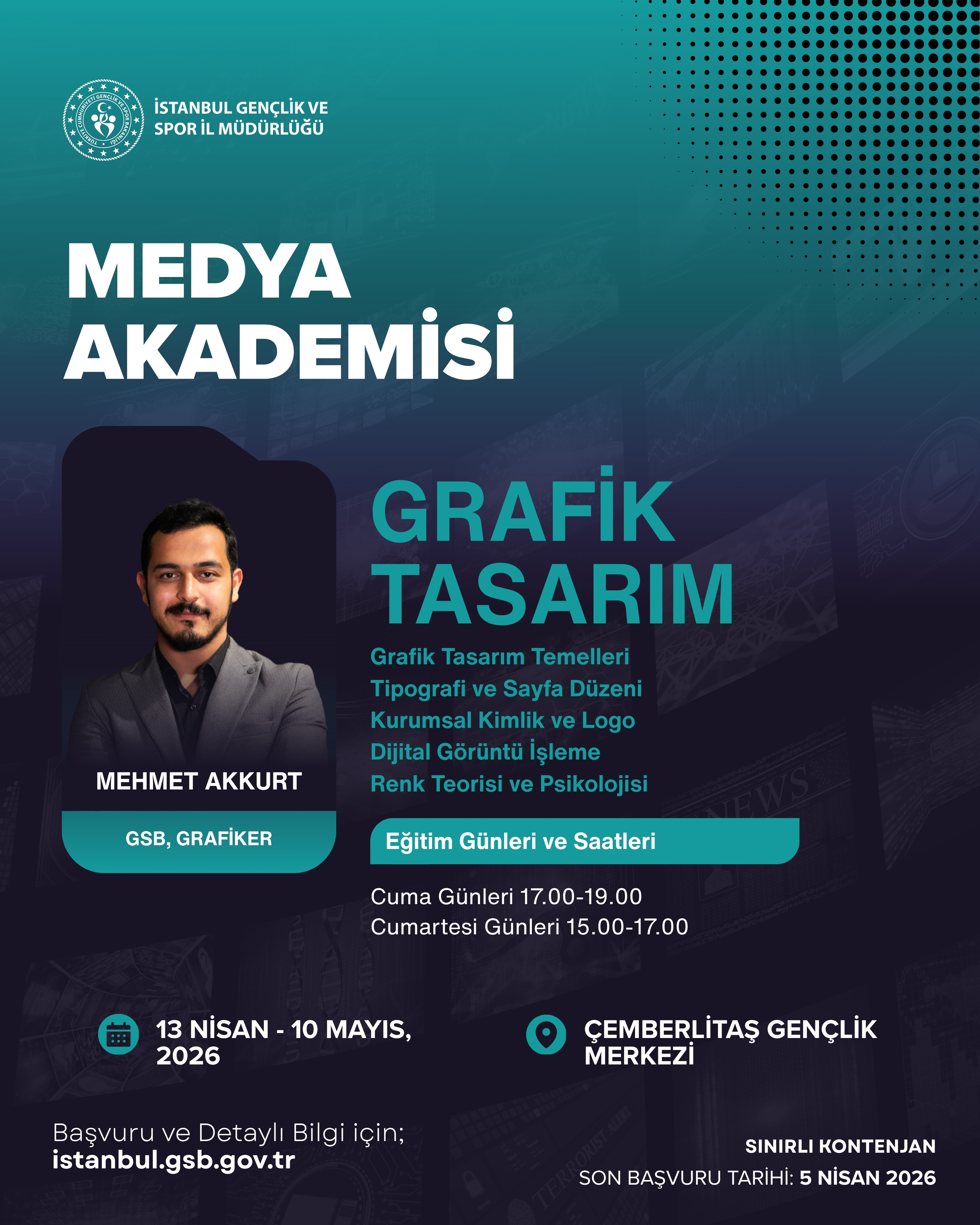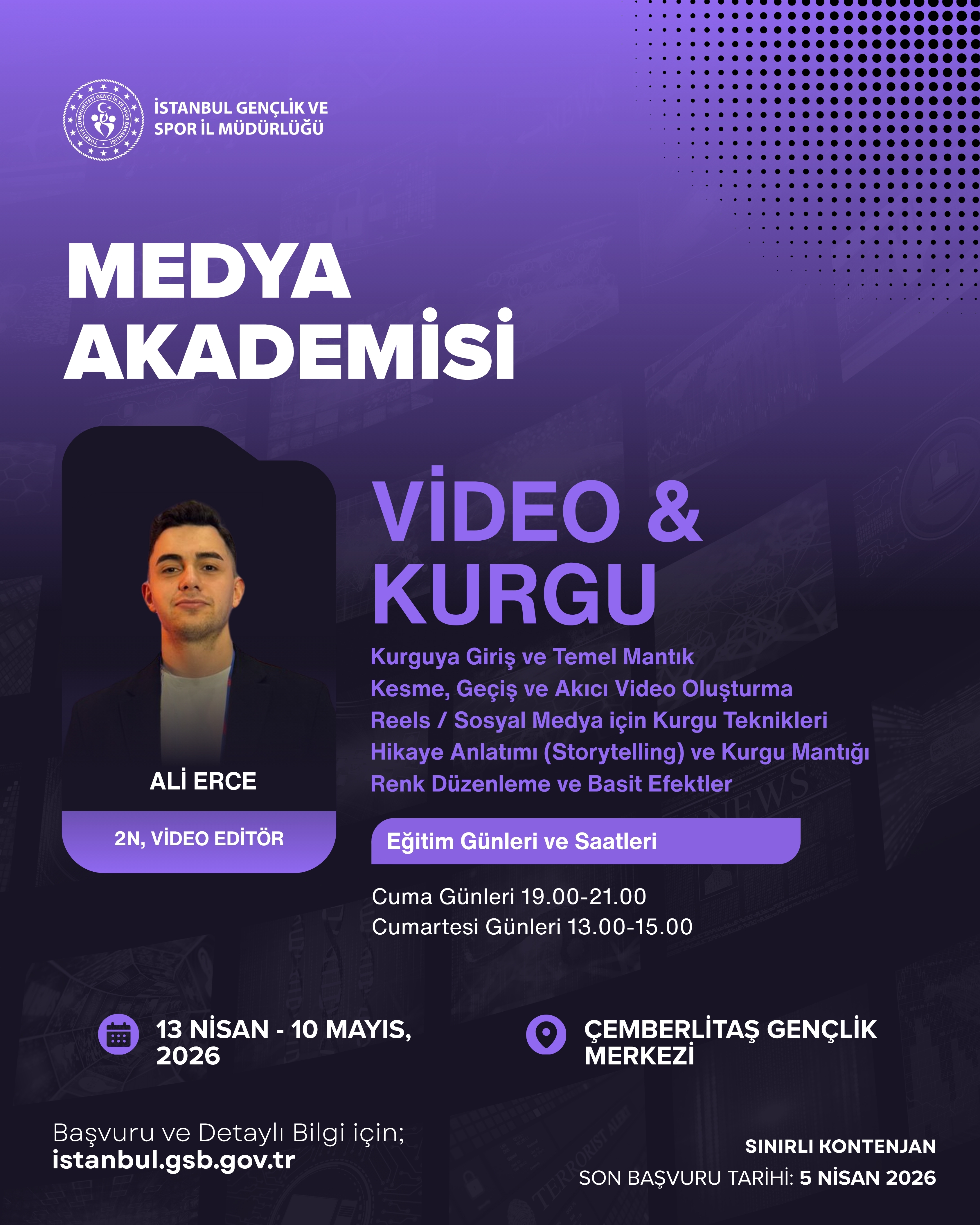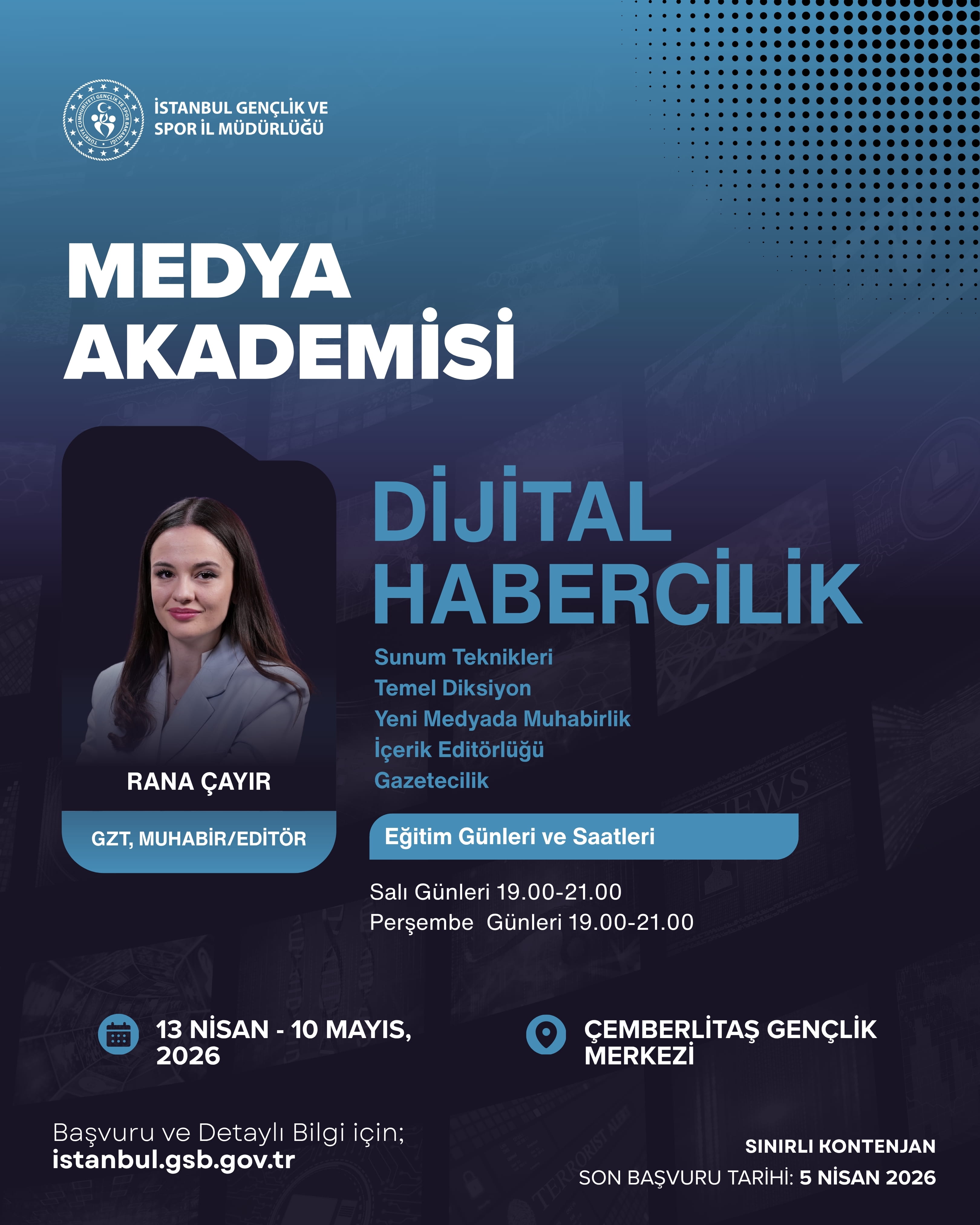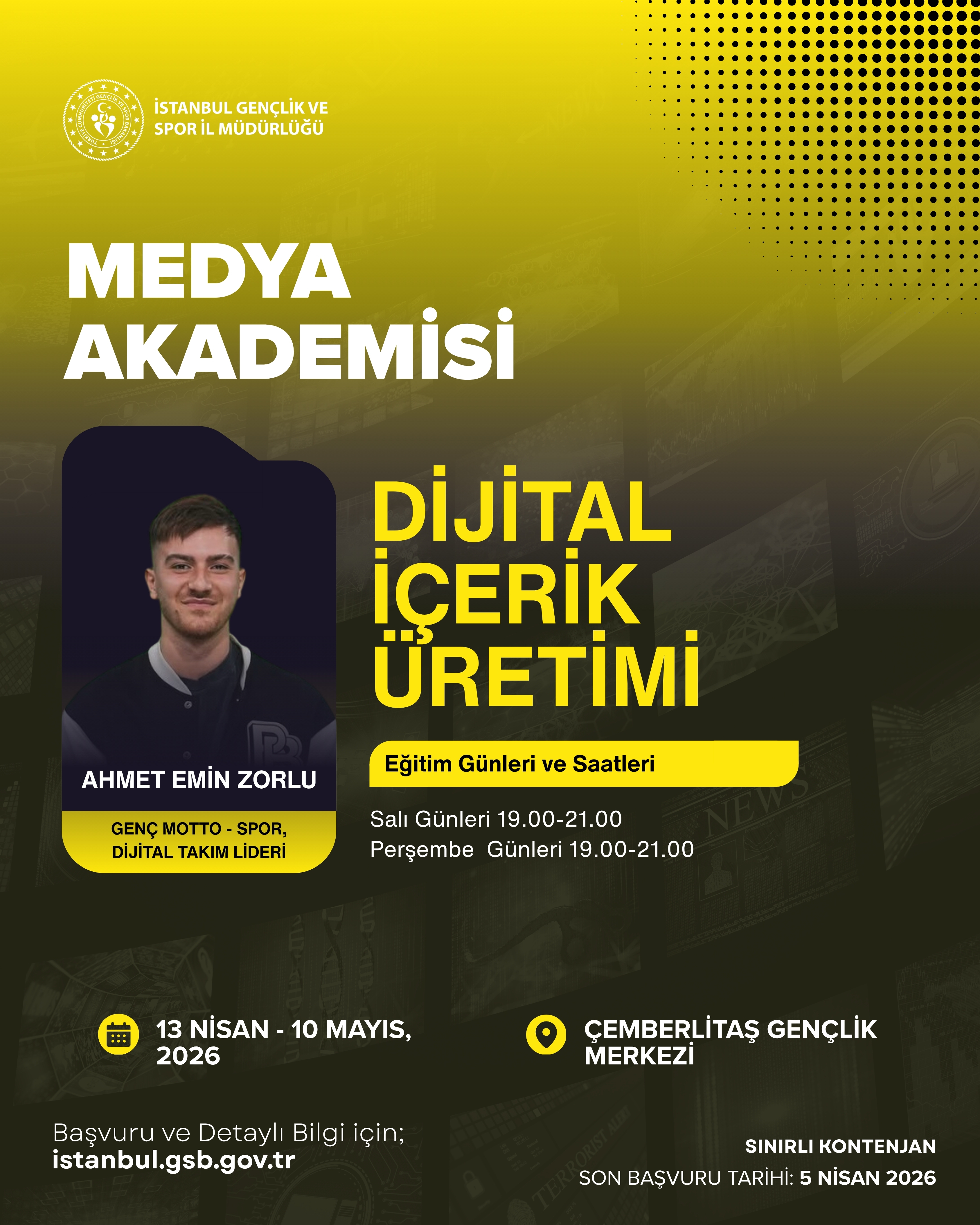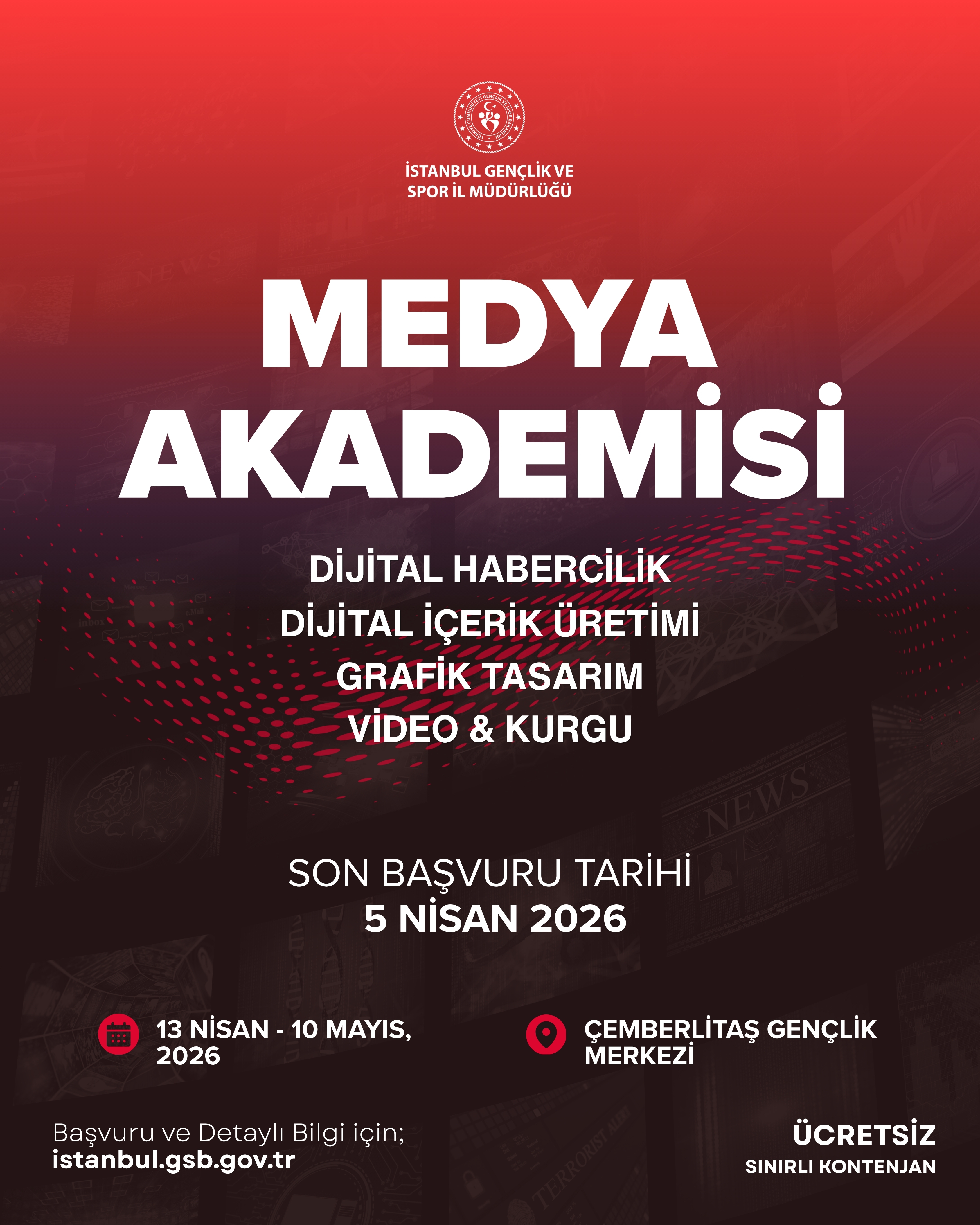 İstanbul Gençlik ve Spor il Müdürlüğü, dijital dünyanın dinamiklerine hakim, içerik üretiminde fark yaratacak gençler yetiştirmek amacıyla Medya Akademisi gerçekleştirecektir. İlgili program İl Müdürlüğüne bağlı Çemberlitaş Gençlik Merkezinde 13 Nisan 2026-10 Mayıs 2026 tarihlerinde ücretsiz gerçekleştirilecek olup eğitim branşları aşağıdaki şekildedir: